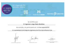 Miembro integrante del Jurado, en la 11° edición de Expo UIOTEC, en representación del Colegio de Ingenieros de la Provincia de Buenos Aires. En dicho evento participan los alumnos que se encuentran cursando el último año de escuelas secundarias técnicas, públicas y privadas, de la provincia de Buenos Aires. La muestra consta de 2 etapas: la presentación de los proyectos en los stand, y la "evaluación de capacidades", donde los alumnos explican sus proyectos ante un jurado integrado por industriales y académicos. Organizado por la Unión Industrial del Oeste, Ente de Promoción Industrial Buenos Aires - MORON (EPIBAM) - Parque Industrial La Cantábrica, Tres Arroyos 329 Haedo BA -ARGENTINA- |